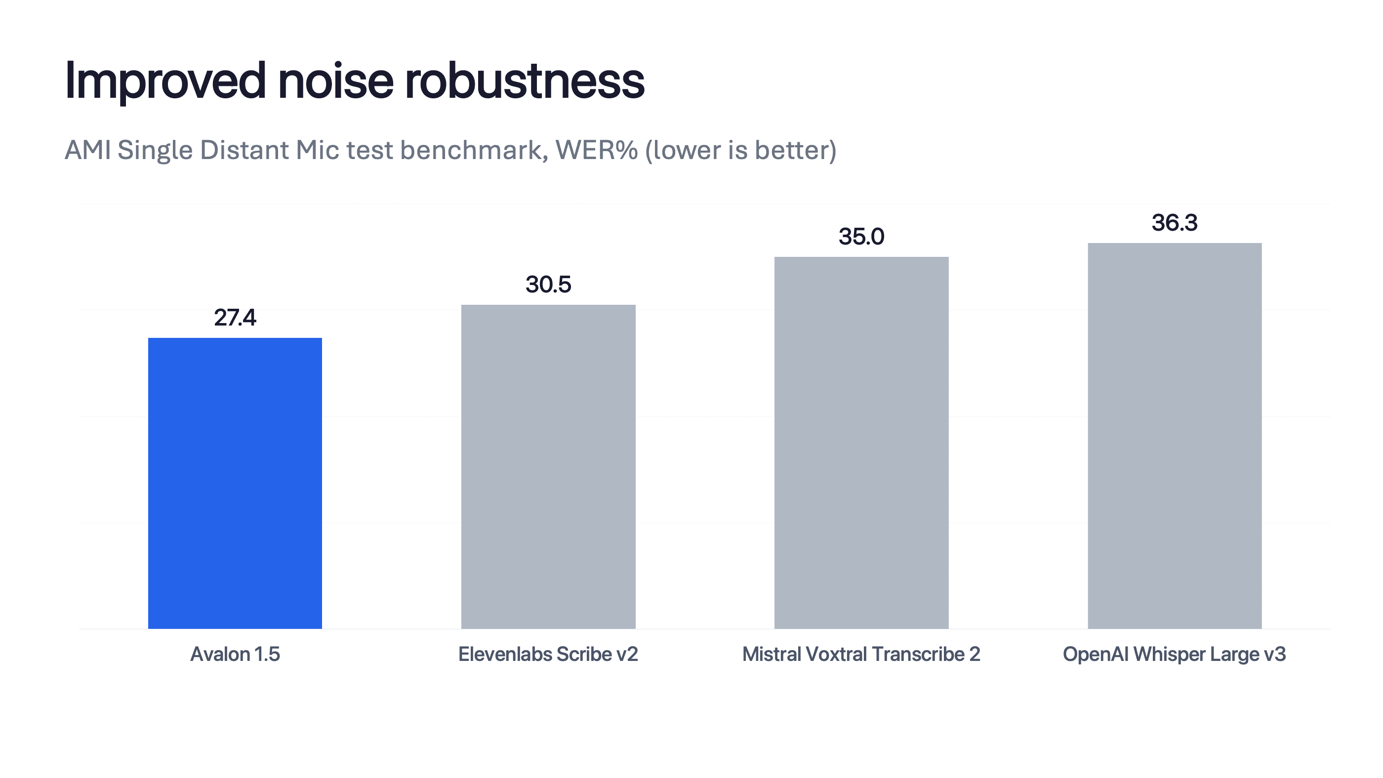 By training on real voice input cases, we didn’t just improve Avalon 1.5’s handling of everyday speech; we also improved its resilience on everyday microphones and environments. The AMI Distant-Mic dataset is notoriously difficult: it features distant microphones, heavy crosstalk, and noise. It’s like any modern office, and Avalon 1.5 achieves state-of-the-art performance here too.