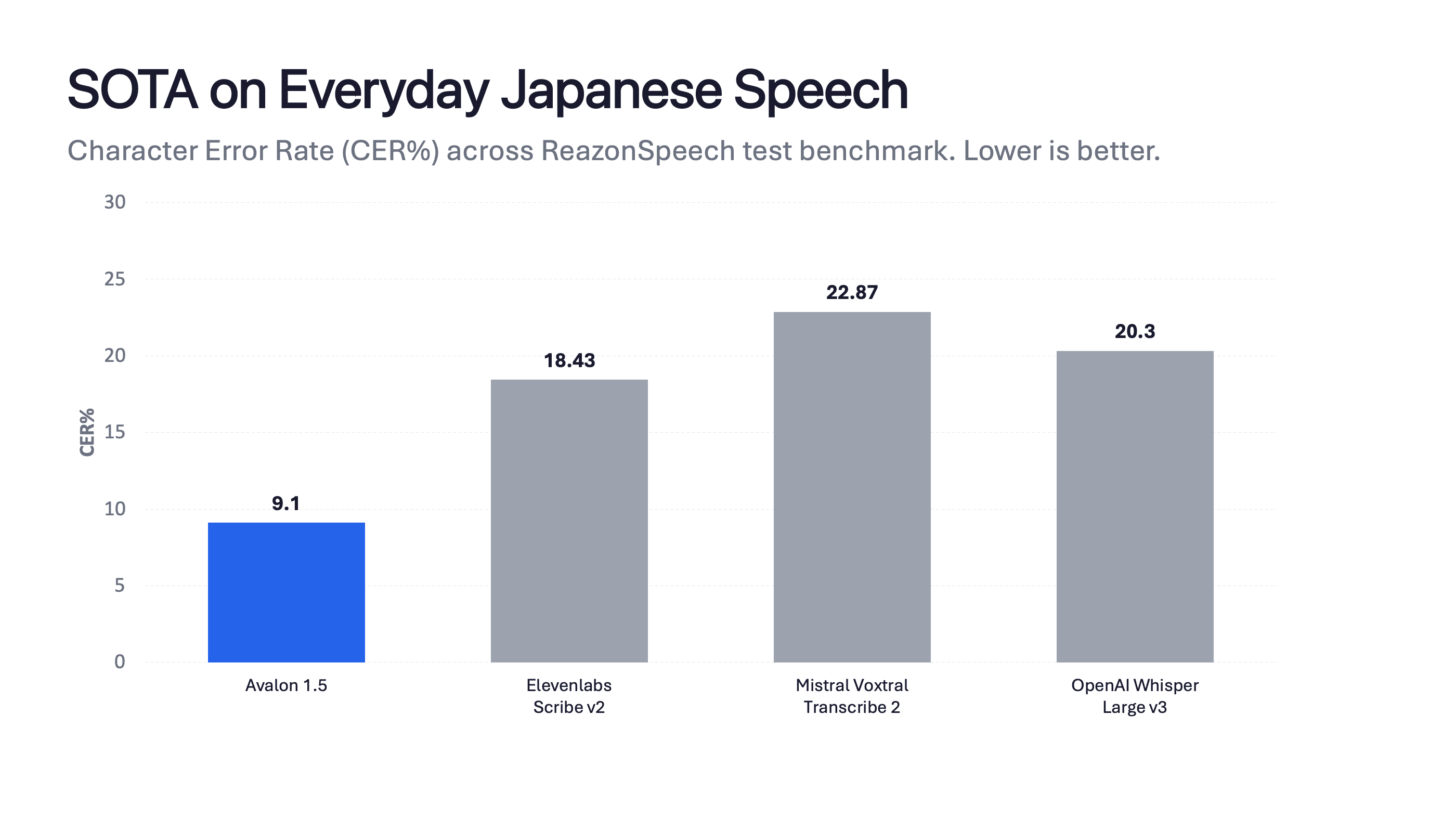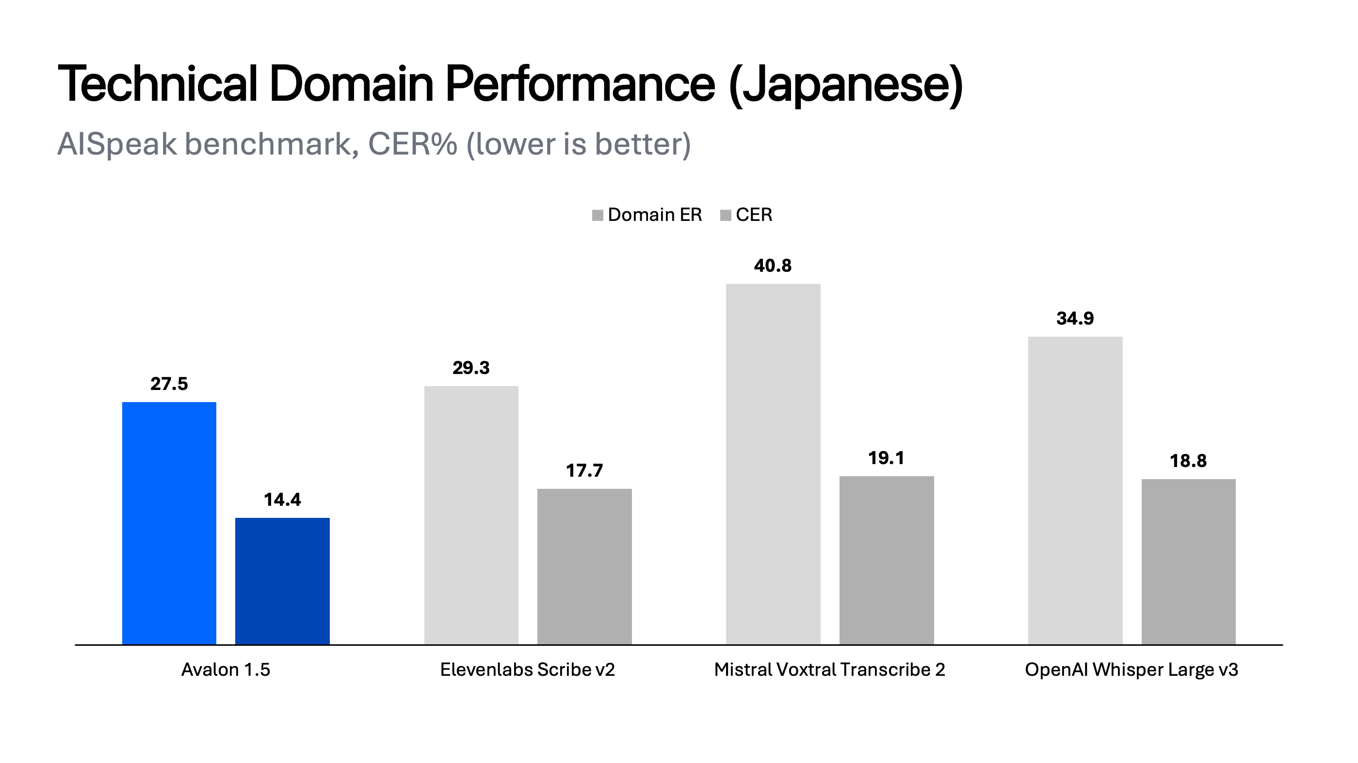 Avalon 1.5 is also our first natively multilingual model, which shows state-of-the-art results across several languages. Of particular note is the jump in accuracy on both large standard benchmarks of everyday speech like Reazonspeech, and on agentic dictation, as shown in our AISpeak Japanese benchmark: