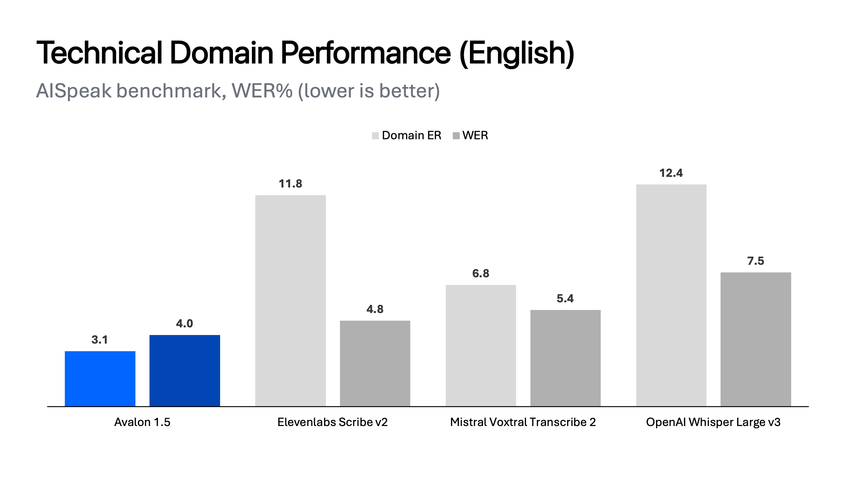 It scores a 5.55 WER average on the industry-standard OpenASR leaderboard, down from 6.24 for Avalon 1.